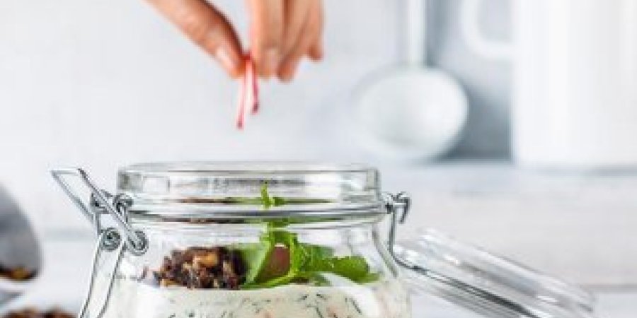 Quark und alle Zutaten bis und mit Salz verrühren, Lachs, Dill und Radiesli-Grün darunterrühren, in die Gläser verteilen. Radiesli darauf verteilen. Streusel darauf verteilen.